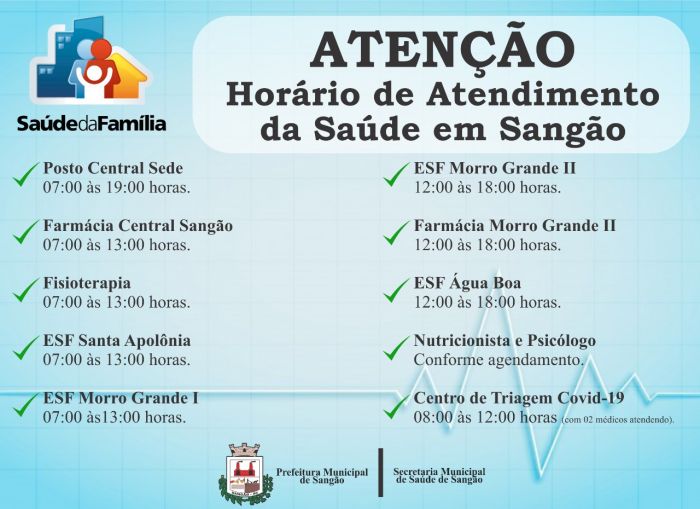 A Secretaria de Saúde de Sangão divulgou os horários de atendimento para as pessoas que precisam utilizar o sistema de saúde do município. É importante ressaltar que todos devem adotar os protocolos ao acessar qualquer ambiente, como máscaras, higienização das mãos com álcool gel e também obedecer ao distanciamento necessário.