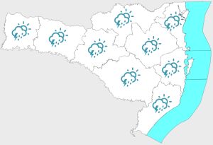 As temperaturas variam entre 30°C e 34°C no Litoral Norte e Vale do Itajaí, e entre 29°C e 31°C nas demais regiões, com máximas menores nas áreas serranas (25°C a 27°C).