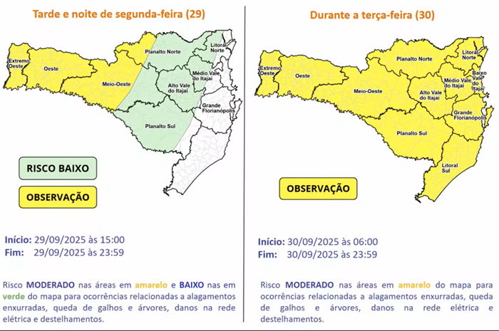 A Defesa Civil emitiu um alerta para o risco de temporais e chuva intensa em Santa Catarina no início desta semana. Para esta segunda-feira (29), as chances de instabilidade se concentram especialmente no Oeste e nas áreas mais altas do Norte que fazem divisa com o Paraná. Já na terça-feira (30), a condição se espalha para todas as regiões do estado.