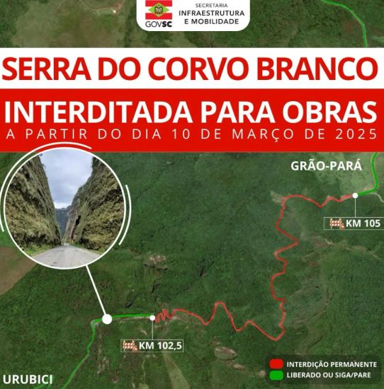 A Serra do Corvo Branco terá o trecho entre os quilômetros 102,5 e 105 totalmente fechado a partir desta segunda-feira, dia 10. O fechamento se dá devido à continuidade das obras de implantação asfáltica, que incluem detonações de rocha e outros serviços pesados em um trecho íngreme da rodovia SC-370, que liga o Planalto ao Sul catarinense.