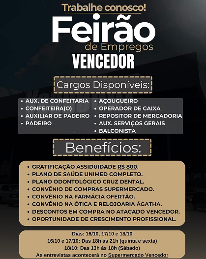 Enquanto isso, o Supermercado Vencedor também ampliará sua atuação em Braço do Norte com a abertura de uma segunda filial, conforme apurado pelo Portal Hora Hiper. A empresa anunciou um Feirão de Empregos nos dias 16, 17 e 18 de outubro, oferecendo vagas para cargos como açougueiro, balconista, operador de caixa, repositor, auxiliar de serviços gerais e confeiteiro(a). Entre os diferenciais estão a gratificação de assiduidade de R$ 800, plano de saúde Unimed completo, plano odontológico, convênios com farmácias e óticas, além de descontos no Vencedor Atacado e oportunidades reais de crescimento profissional.