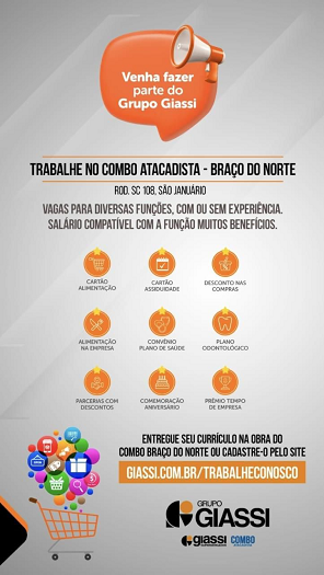 Já o Grupo Giassi, que se prepara para inaugurar em breve o Combo Atacadista na rodovia SC-108, no bairro São Januário, também iniciou a seleção de novos colaboradores. Há vagas para diversas funções, com ou sem experiência, e a empresa destaca um pacote de benefícios que inclui cartão alimentação, convênio com plano de saúde e odontológico, alimentação na empresa, descontos em compras, cartão assiduidade, comemoração de aniversário e prêmio por tempo de empresa. Os interessados podem entregar o currículo diretamente na obra ou cadastrar-se pelo site giassi.com.br/trabalheconosco.