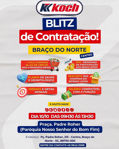 O SuperKoch, que se prepara para abrir sua loja no Centro, promoveu na última sexta-feira uma “Blitz de Contratação” na Praça Padre Roer. A rede oferece benefícios como vale-compras de até R$ 1.800,00 nos três primeiros meses, planos de saúde e odontológico, programa de participação nos resultados (PPR), prêmios por metas mensais, além de descontos em compras realizadas nas lojas da rede. As oportunidades abrangem diferentes cargos, com salários compatíveis com as funções.