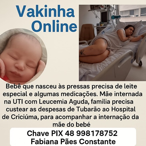 Anthony Guimarães Maximiano, de três semanas, nasceu de forma antecipada em Criciúma e necessita de leite infantil e medicamentos, enquanto a mãe, Marília Constante Guimarães, diagnosticada com leucemia mieloide aguda, realiza tratamento no Hospital São José. A família solicita doações para auxiliar nos custos com alimentação e deslocamento.