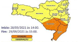A condição meteorológica está prevista para ocorrer entre hoje e amanhã, segundo aviso da Defesa Civil e da Epagri