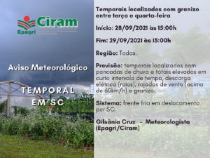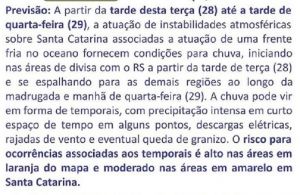 A Epagri Ciram fez um alerta (veja gravura abaixo) hoje (28) sobre a previsão de temporais localizados com pancadas de chuva e totais elevados em um curto intervalo de tempo em Santa Catarina.