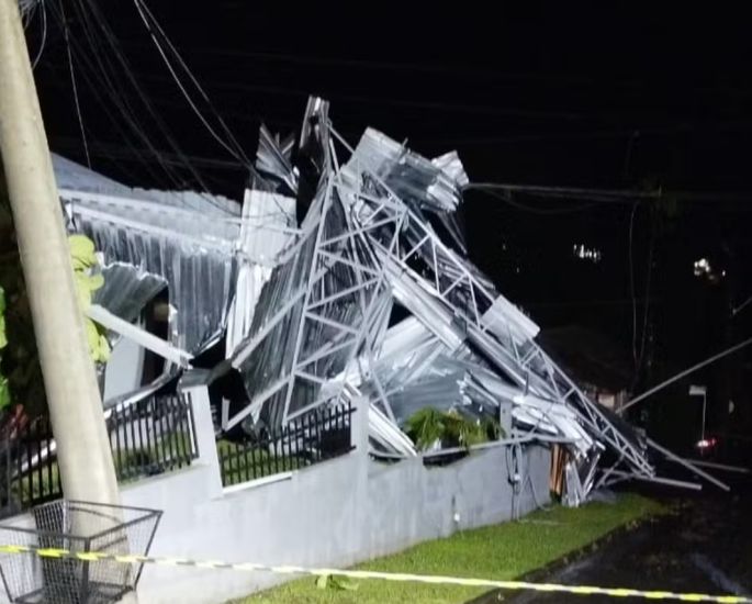 Cidades do Oeste de Santa Catarina registraram estragos após a passagem de temporais na noite de segunda-feira (29). Em Águas de Chapecó, parte do telhado de uma edificação foi arrancado pelo vento e lançado contra outra residência, atingindo ainda um carro e a rede de energia elétrica. Ruas ficaram alagadas e uma ponte submergiu na região. Ninguém ficou ferido.
