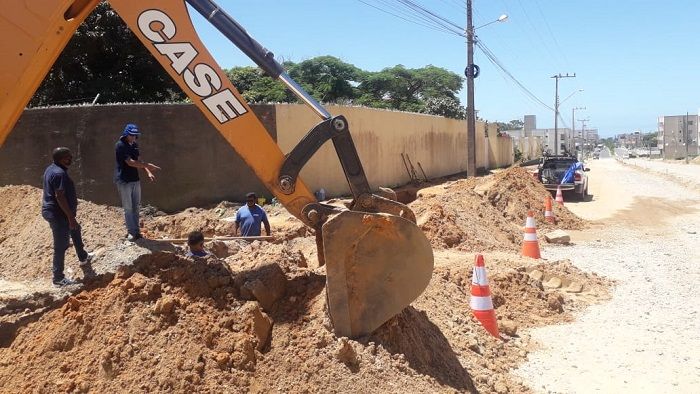 A drenagem já foi concluída. Agora, a equipe da Serrana Engenharia trabalha na ligação do saneamento da rua, paralelamente à colocação do material que serve como base para o asfalto.
