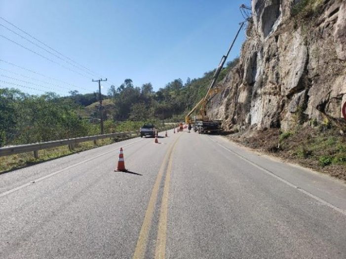 Também será feita a retirada de blocos rochosos e outros materiais que estão soltos e sobre os taludes. Atualmente, os trabalhos são realizados em sete pontos da rodovia.