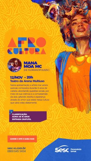 Tubarão sediará o evento AfroCultura entre os dias 12 e 14 de novembro, com atividades que destacam a importância das influências africanas na formação social e cultural de Santa Catarina. A programação inclui o rapper Mana Moa MC no dia 12, o espetáculo de dança "Borboleta Azul" no Museu Ferroviário no dia 13, e a banda Cores de Aidê no dia 14. O evento é uma realização do Sesc SC com apoio da Fundação Municipal de Cultura.