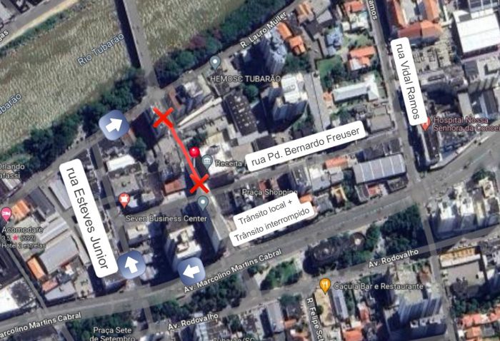 A Tubarão Saneamento informa que a Rua Tubalcain Faraco, no trecho entre as ruas Bernardo Freuser e Lauro Muller, terá o trânsito interrompido neste domingo (21) das 7h às 18h para a execução de obras na rede coletora de esgoto no bairro Centro.