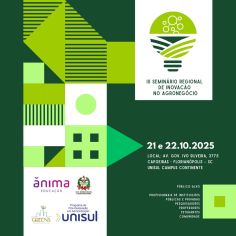 A Universidade do Sul de Santa Catarina (Unisul) – Campus Continente – realiza nos dias 21 e 22 de outubro o III Seminário Regional de Inovação no Agronegócio, evento que reunirá especialistas, empreendedores e produtores rurais para debater os desafios e as novas tecnologias do setor agro em Santa Catarina.