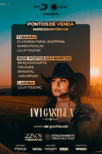 O público do Sul de Santa Catarina já pode garantir presença em um dos shows mais aguardados do ano: Ana Castela vem a Tubarão para uma apresentação que promete lotar o público com seus grandes sucessos do agronejo. Conhecida por hits como "Nosso Quadro" e "Solteiro Forçado", a cantora promete um espetáculo animado e repleto de surpresas.
