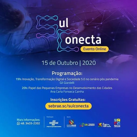 Quem tiver interesse em acompanhar o evento que será totalmente online e gratuito deve realizar uma inscrição prévia através do link sebrae.sc/sulconecta. Mais informações podem ser obtidas através do telefone (48) 3403-2202.