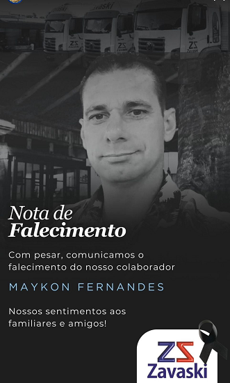 A empresa Zavaski manifestou pesar pela morte do colaborador Maykon Fernandes, vítima de um grave acidente de trânsito registrado na BR-116, no estado de São Paulo. O motorista, natural de Braço do Norte, não resistiu aos ferimentos após a colisão e morreu ainda no local.