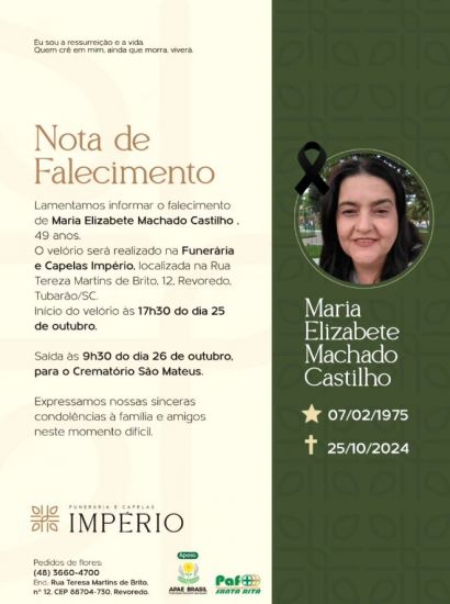 A identificação foi confirmada e a Funerária e Capelas Império informou que o velório de Maria Elizabete ocorrerá ainda nesta sexta, a partir das 17h30, em Tubarão. O sepultamento será realizado no dia 26 de outubro no Crematório São Mateus.