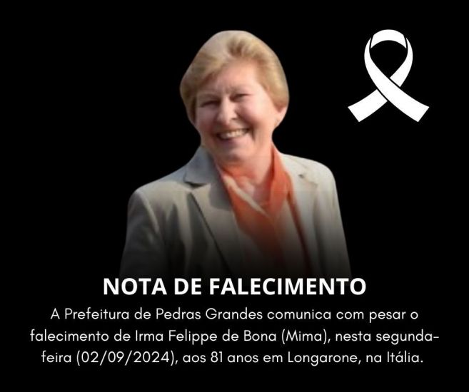 A Prefeitura de Pedras Grandes comunica com pesar o falecimento de Irma Felippe de Bona, na manhã desta segunda-feira, em Longarone, na Itália.