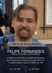 Tubarão se despede nesta quarta-feira (26) de Felipe Fernandes, de 33 anos, filho do ex-vereador João Fernandes. A notícia de sua morte gerou comoção na cidade, com familiares e amigos compartilhando mensagens de homenagem e gratidão.