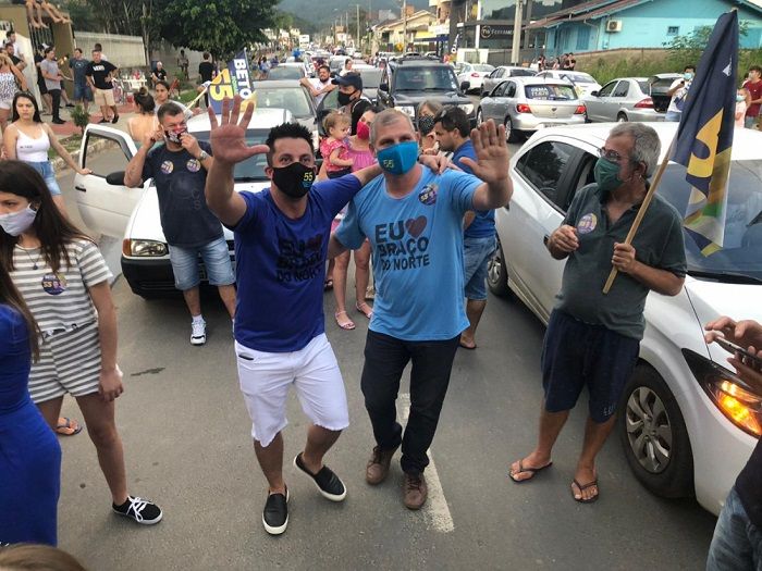 Nesse momento a dupla mais uma vez vencedora em Braço do Norte desfila em uma carreta para comemorar a vitória nas urnas mesmo que os órgãos oficiais ainda não confirmem.