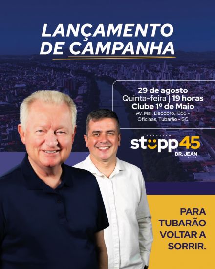 A coligação "Para Tubarão Voltar a Sorrir", formada pelos candidatos Carlos Stüpp e Jean Abreu, realiza o lançamento oficial de sua campanha na noite desta quinta-feira (29). O evento, marcado para as 19h, acontecerá na sede do Clube 1º de Maio, em Tubarão, e contará com a presença de diversas lideranças políticas, incluindo o ex-governador Carlos Moisés, que demonstra apoio à candidatura.