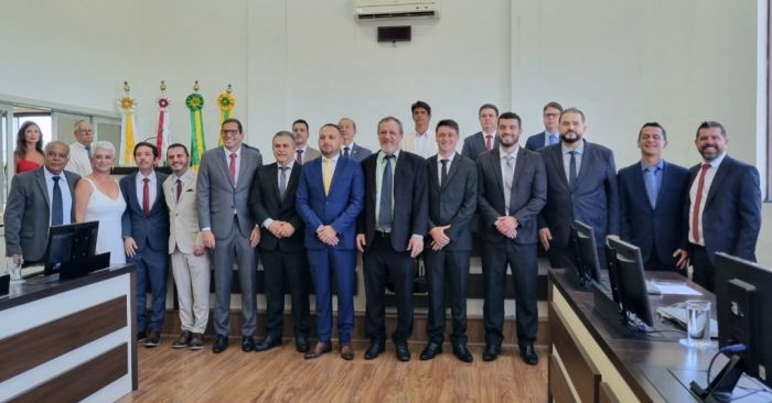 Sob a presidência de Cleosmar Fernandes (MDB), por ser o mais velho entre os eleitos com 64 anos, foram empossados hoje pela manhã: Anderson Silveira de Souza e Eduardo Carneiro (Podemos), Cleosmar Fernandes, Valdomiro Barbosa, Edi Goulart Nunes, Vítor Elíbio e Rhoomening Rodrigues (MDB), Tanara Cidade (PT), Fernando Mendonça (PP), Hirã Floriano Ramos, Gabriel Carvalho Martins e Luiz Otávio Pereira (PL) e Jaleel Laurindo Farias (PSD). Mais votado na eleição de outubro, com pouco mais de 1,5 mil votos, Anderson Silveira teve o mandato cassado, mas como está recorrendo da decisão, pôde ser diplomado e poderá assumir o mandato até decisão do Tribunal Regional Eleitoral (TRE).