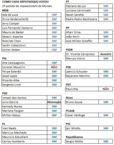 Eram necessários 27 votos para a aprovação do PDL. Moisés precisava de 14 votos para evitar a instauração do segundo processo de impeachment. A única ausência durante a votação foi do deputado Dr. Vicente Caropreso (PSDB), por motivos de saúde.