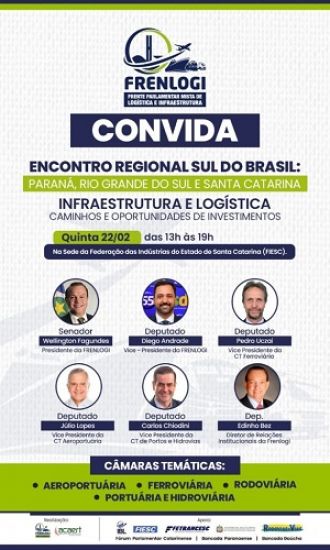 A Frente Parlamentar Mista de Logística e Infraestrutura (FRENLOGI) promoverá o Encontro Regional Sul do Brasil, que reunirá os estados de Santa Catarina, Paraná e Rio Grande do Sul com o propósito de discutir os avanços socioeconômicos no âmbito da infraestrutura e logística, destacando os caminhos e as oportunidades de investimento na região, que é um dos principais corredores econômicos do país.