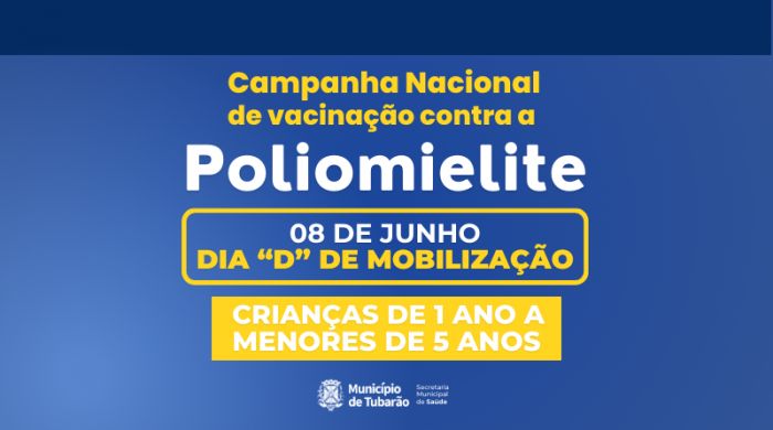 A Campanha Nacional de Vacinação contra a Poliomielite, iniciada na última semana, terá seu Dia D neste sábado, 8 de junho. Nesse dia, as Unidades Básicas de Saúde de Tubarão estarão abertas para vacinar crianças entre 1 ano e 4 anos, 11 meses e 29 dias.