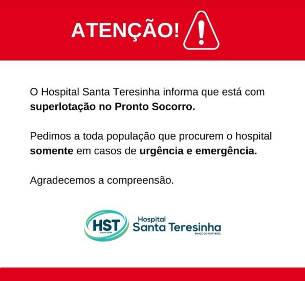 O Hospital Santa Teresinha, localizado na cidade de Braço do Norte, está com superlotação no Pronto Socorro da instituição. O hospital pede à população que busque seus serviços apenas em casos de urgência e emergência. A medida tem o objetivo de garantir o atendimento adequado e prioritário para pacientes que necessitam de cuidados imediatos.