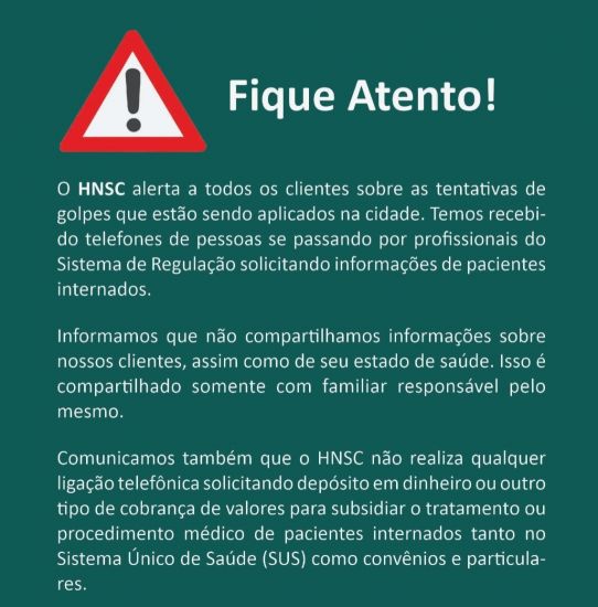 O Hospital Nossa Senhora da Conceição (HNSC) emitiu um alerta nesta segunda-feira (29) sobre tentativas de golpes que têm sido relatadas na cidade. Conforme comunicado oficial, há registros de telefonemas de indivíduos se passando por profissionais do Sistema de Regulação, solicitando informações de pacientes internados.