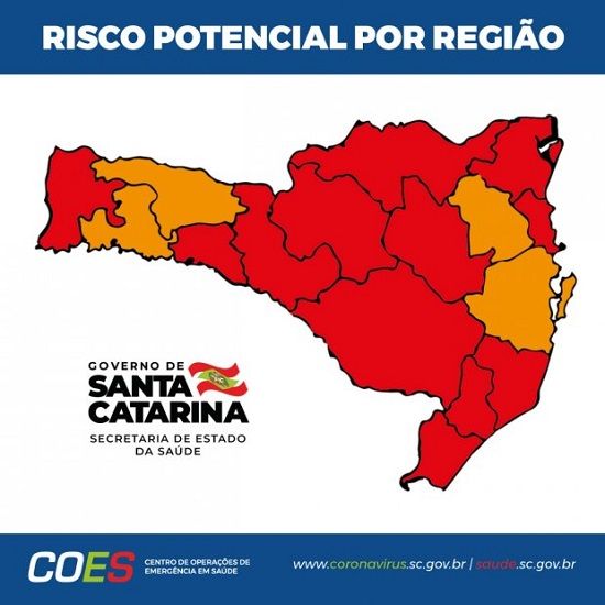 A Matriz de Risco Potencial divulgada nesta quarta-feira, 30, pelo Governo de Santa Catarina e Secretaria de Estado da Saúde (SES) classifica 12 das 16 regiões de saúde do estado como em alerta gravíssimo (cor vermelha) para o novo coronavírus.