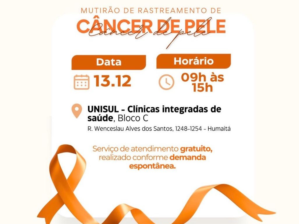 A cidade de Tubarão recebe no próximo sábado (13) um mutirão de rastreamento de câncer de pele, que ocorrerá na Unisul. A iniciativa faz parte da campanha Dezembro Laranja, voltada à conscientização e prevenção da doença, e tem como objetivo principal atender pacientes que aguardam consulta no SUS, além de receber o público em geral com suspeitas de câncer de pele.