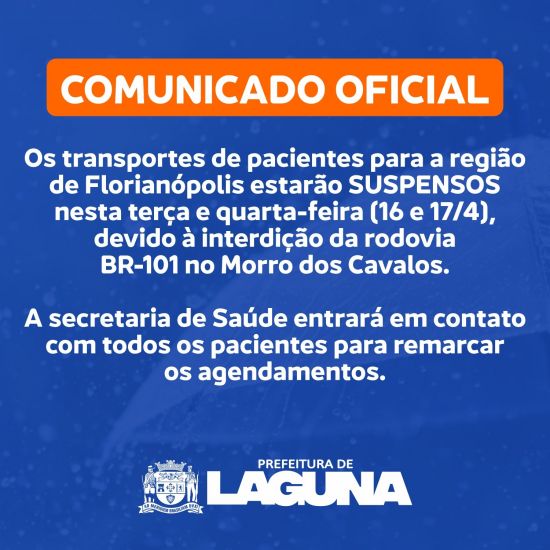 A secretaria de Saúde de Laguna informa aos pacientes de Tratamento Fora de Domicílio (TFD) que os transportes para região de Florianópolis estarão suspensos nesta terça e quarta-feira (16 e 17 de abril).