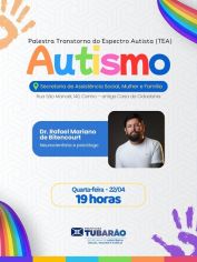 A Secretaria de Assistência Social, Mulher e Família de Tubarão realiza nesta quarta-feira (22) uma palestra sobre o Transtorno do Espectro Autista (TEA), em parceria com o SESC.
