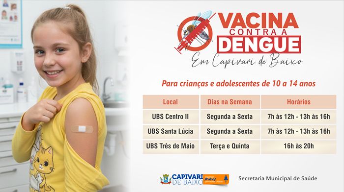 O município de Capivari de Baixo passa a disponibilizar a vacina contra a dengue nas salas de vacinação a partir desta terça-feira (27), para crianças e adolescentes com idades entre 10 e 14 anos. A informação foi divulgada pela Secretaria Municipal de Saúde, após o recebimento das doses encaminhadas pela Secretaria de Estado da Saúde.