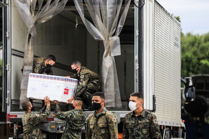 As caixas com mais de três toneladas de materiais para imunização será transportado em um caminhão refrigerado sob escolta dos veículos das forças de segurança até o centro de distribuição, um depósito da Diretoria de Vigilância Epidemiológica que fica em São José, na Grande Florianópolis.