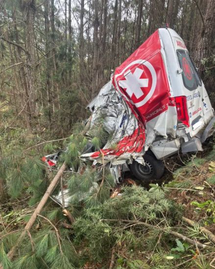 Um acidente grave registrado na manhã desta quarta-feira (18) deixou o motorista de uma ambulância morto e uma técnica de enfermagem ferida em Bom Retiro, na Serra de Santa Catarina. O veículo saiu da pista e bateu em árvores, ficando completamente destruído.