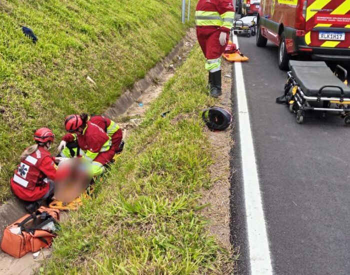 Com o impacto, ambos caíram na valeta do canteiro, o que dificultou o resgate. Os Bombeiros Voluntários e a equipe da CCR ViaCosteira foram acionados para prestar atendimento no local.