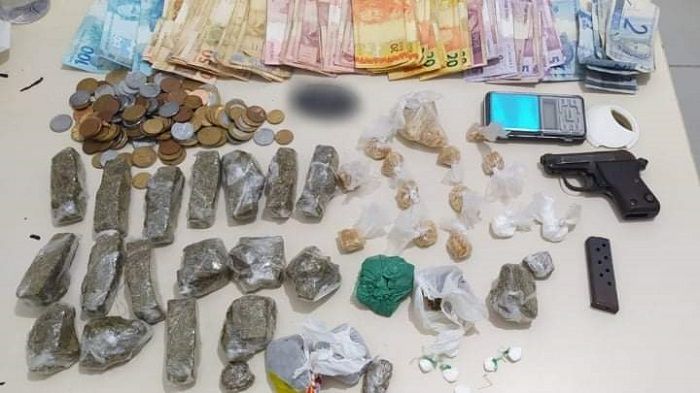 Na caso do menor os policiais encontraram mais drogas (maconha, cocaína e crack), dinheiro e uma arma de fogo. Ele foi levado para a delegacia de Polícia Civil. A idade do adolescente não foi informada.