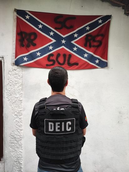 A Polícia Civil de Santa Catarina, por meio da Delegacia de Repressão ao Racismo e Delitos de Intolerância (DRRDI/DEIC), cumpriu na manhã de hoje, sexta-feira, 21, um mandado de busca e apreensão em uma residência em Joinville. A ação faz parte da investigação sobre a exposição da bandeira dos Estados Confederados do Sul dos EUA, um símbolo historicamente associado a grupos supremacistas brancos.