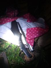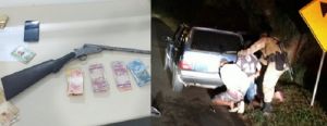 Em seguida, a PM obteve a informação de que a arma usada no roubo estaria escondida às margens de uma estrada de chão, em um pasto, e enrolada em uma toalha no bairro Olaria, em Armazém.