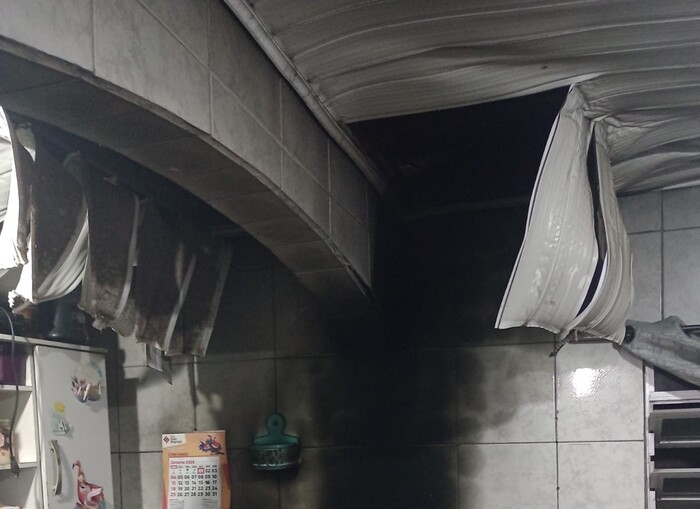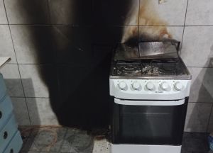 Devido à chama intensa e ao calor irradiado, o incêndio acabou causando danos em objetos próximos, atingindo o fogão, parte da parede e o forro de PVC do teto da residência.