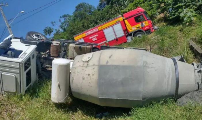 Os Bombeiros foram acionados para prestar apoio e tomar medidas de segurança. Ao chegarem ao local, encontraram o motorista já fora do caminhão betoneira, consciente e orientado.