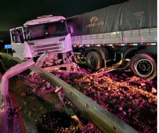 Durante a ocorrência, os bombeiros constataram um vazamento de óleo diesel nos dois tanques do caminhão. A guarnição realizou a contenção para evitar que o combustível se espalhasse pela pista.