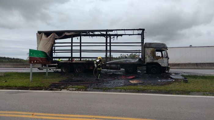 Um caminhão foi destruído por um incêndio na tarde desta sexta-feira (24), na BR-101, em Barranceira, na região Norte de Laguna.