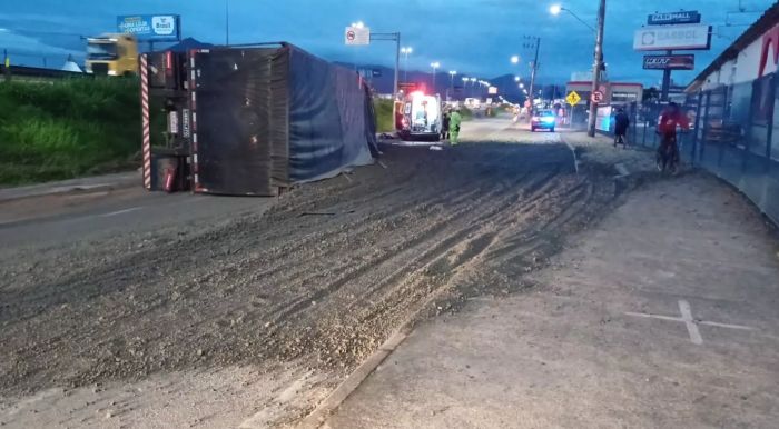 Um caminhão tombou e bloqueou a via marginal da BR-101, no km 213, sentido sul, em Palhoça, na manhã desta segunda-feira (10). O acidente aconteceu por volta das 5h30, em frente à Cassol, e o veículo, um caminhão-caçamba, transportava carga, que se espalhou pela pista, impedindo o tráfego no local.