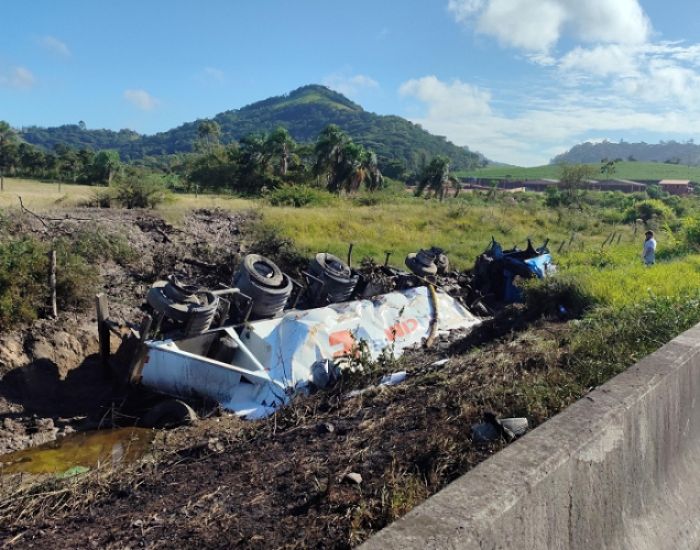 Na manhã desta quinta-feira, 27, um acidente envolvendo um caminhão na BR-101, em Sangão, gerou incêndio e causou lentidão no tráfego. O caminhão, carregando combustível, saiu da pista no km 356, perdeu o controle da direção e tombou no canteiro da rodovia. O veículo pegou fogo logo após o acidente, gerando um incêndio que se espalhou pelo gramado no acostamento.