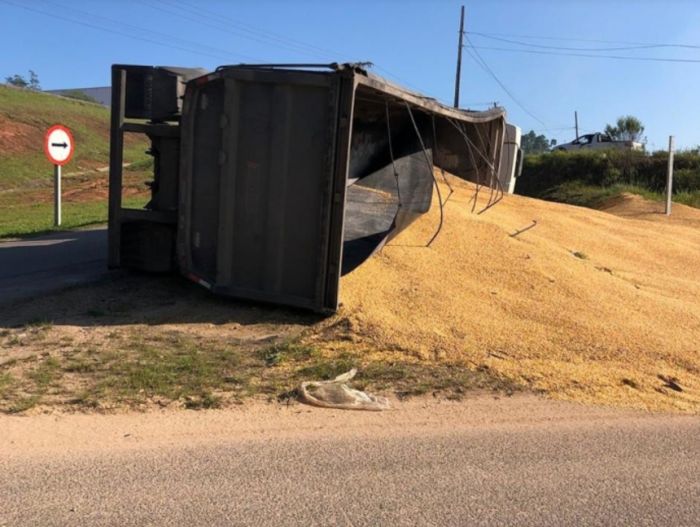 O veículo tombou durante uma curva, espalhando a carga de milho às margens da rodovia