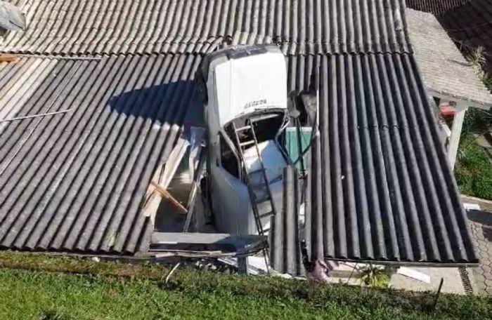 Na tarde desta sexta-feira (07), por volta das 14h20, um carro despencou sobre o telhado de uma residência no bairro Fortaleza, em Blumenau, localizada no Vale do Itajaí.