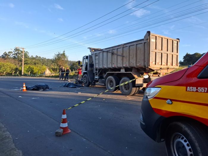 Um grave acidente de trânsito resultou na morte de duas pessoas na tarde deste domingo (6), em Sangão. A colisão frontal entre uma motocicleta e um caminhão foi registrada por volta das 16h13, na rua São João Batista, no bairro Morro Grande.